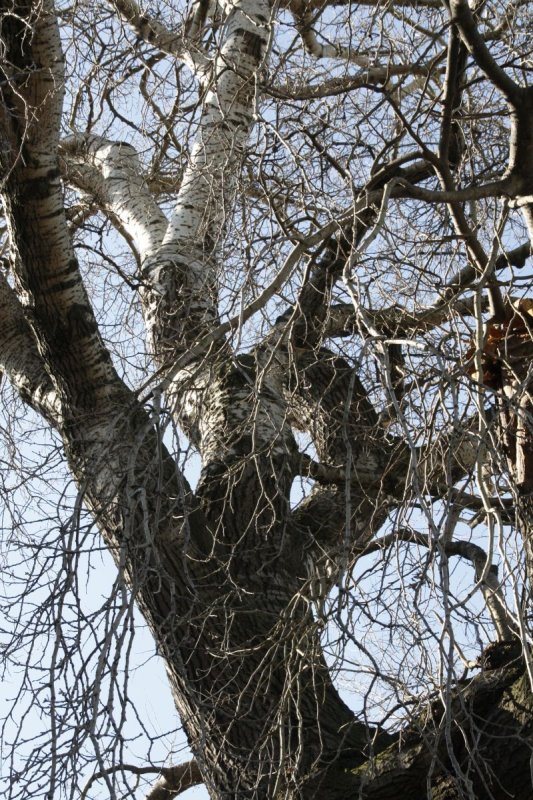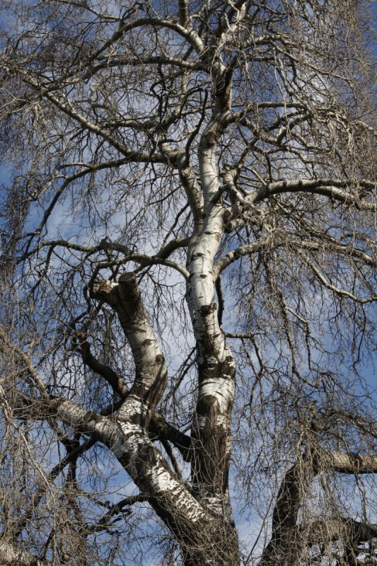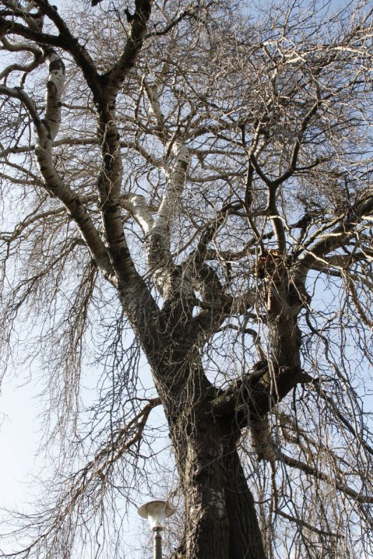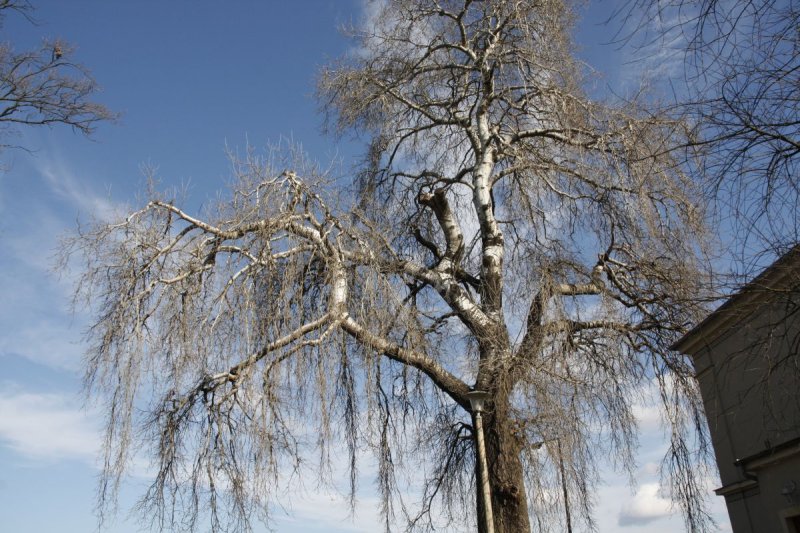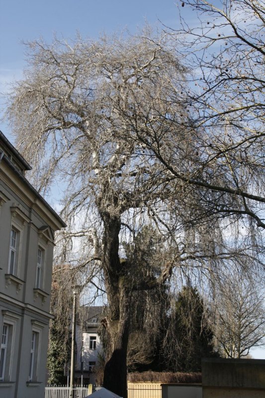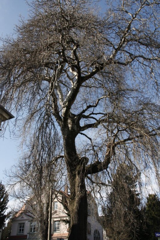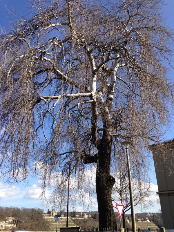 Als ich am 21. Februar 2014 durch Dresden auf dem Käthe-Kollwitz-Ufer entlang fuhr, entdeckte ich diese schon recht große Hänge-Birke. Zuerst dachte ich es ist eine Schwarz-Birke, aber nach der Rinde zu urteilen, ist es eine Hänge-Birke.